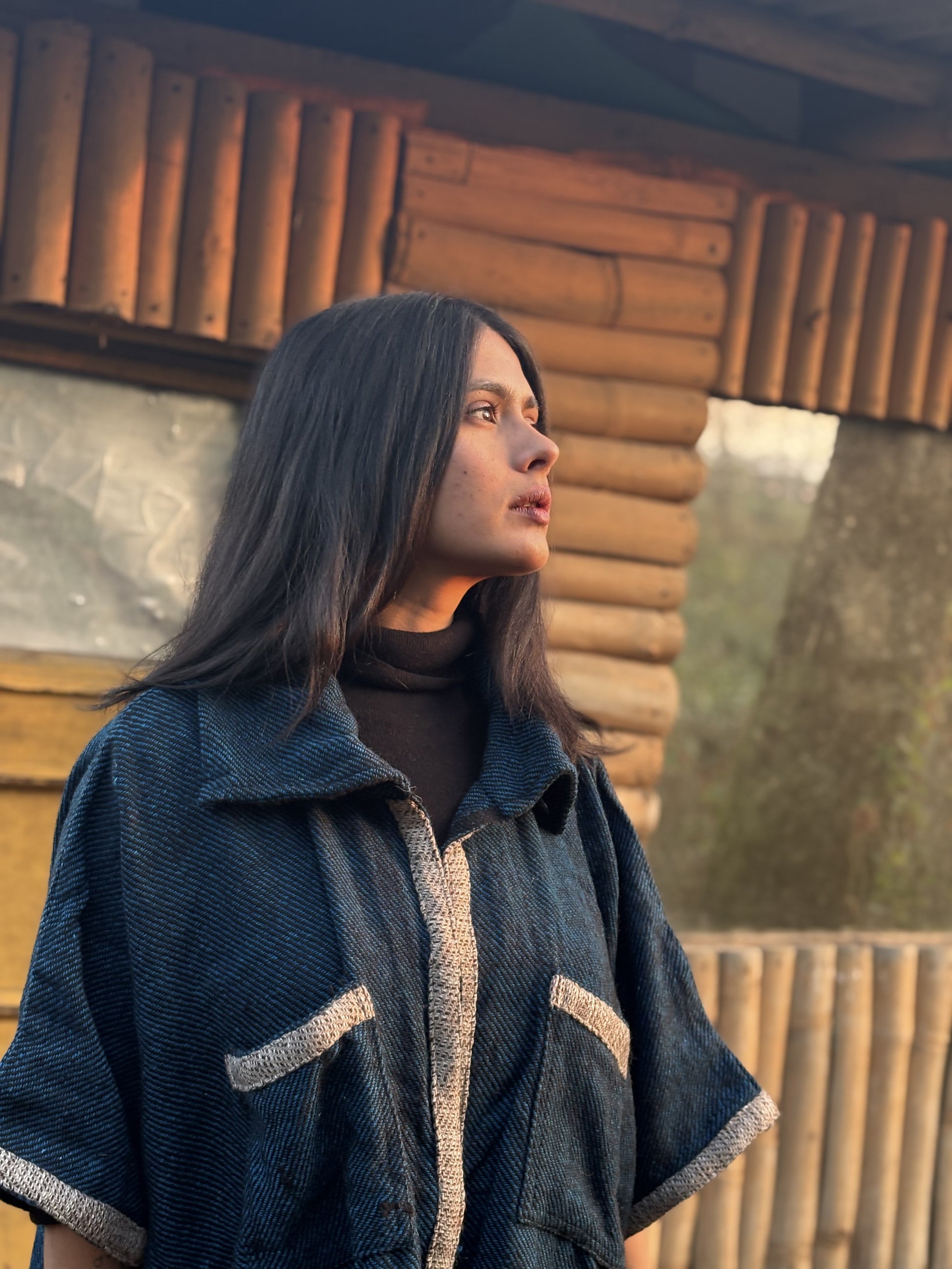 The Nomad Indigo Shacket elegantly merges the style of a shirt and jacket, crafted from exquisite Himachali Shawl Fabric woven with fine threads and accentuated by subtle beige borders for a refined touch. Perfect for crisp, sunny winter mornings.